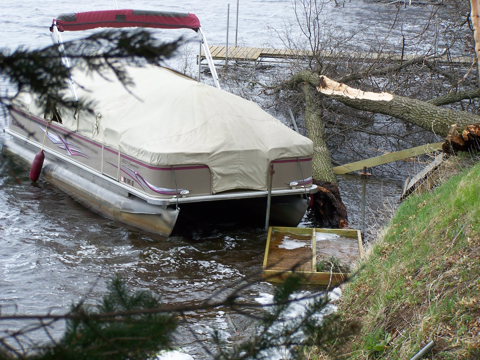 Yesterday morning started as any other ordinary Monday morning. Joel off to the cities at 4 am, me & puppies up at 7 am and Jonathan off to school. Each morning when I get up, I love to look out over the lake from our bedroom window. It is the most peaceful and beautiful sight. This Monday morning was a little different as I looked to the south and there was just a small horizon of sunlight and to the north it was pitch black. I knew we were in for a doosie of a storm. It took a matter of no time before the storm was upon us with huge down pours, thunder, lightning and quarter sized hail. It stormed for a couple hours, then the wind direction changed and the skies started to lighten up a bit. Once the wind changed......it blew and blew and blew some more. Huge tree branches fell on top of the house which sounded as they were coming through the roof. I keep going outside to make sure things were okie dokie. After several hours of the blowing, I called Joel to see if he could look on his weather monitor at work to see how much longer me & the puppies had to go through this crap! As we were talking, I was standing at the door looking out over the lake. I couldn't believe what I was seeing.......white caps on the lake that had to be 3-4 foot tall. They were coming one after another, pulverizing the boat.